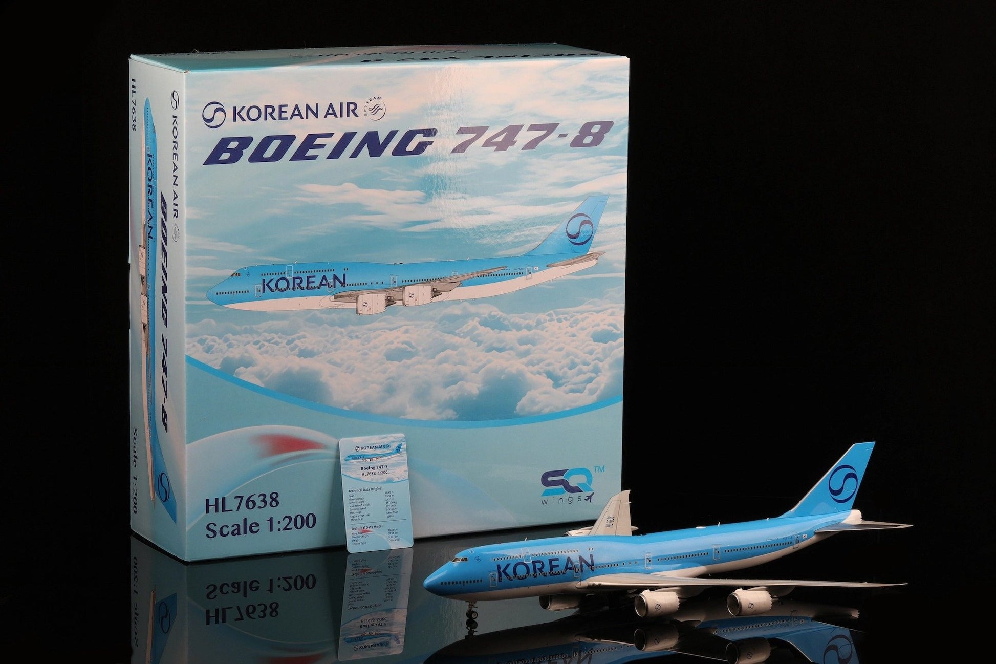 SQ Wings introduces a beautifully detailed 1:200 scale diecast model of the Korean Air Boeing 747-8 Intercontinental, registration HL7638, in the airline’s refreshed livery. As one of the world’s largest operators of the 747-8, Korean Air continues the legacy of the “Queen of the Skies” while showcasing a modernized corporate identity on this flagship aircraft.