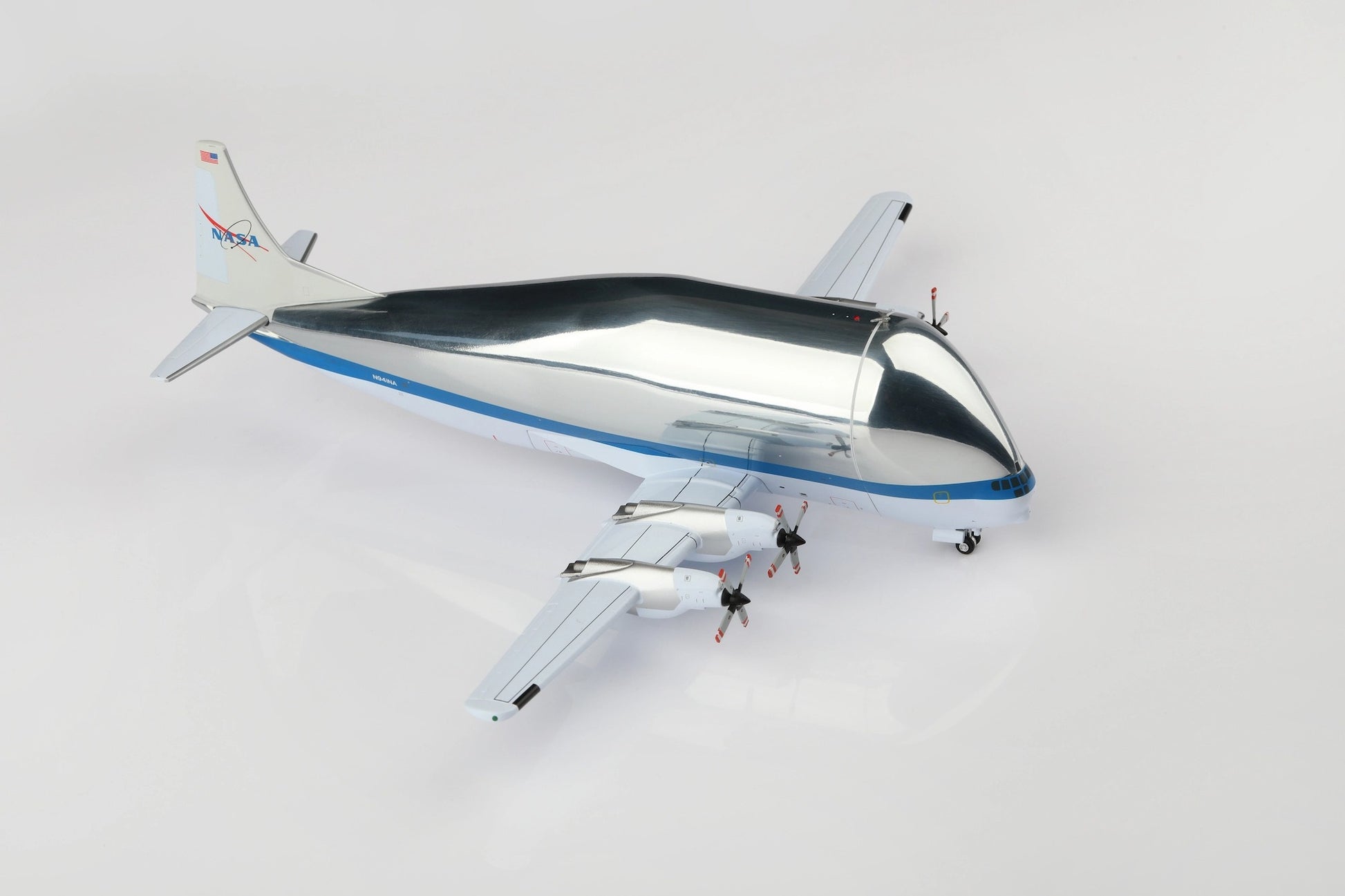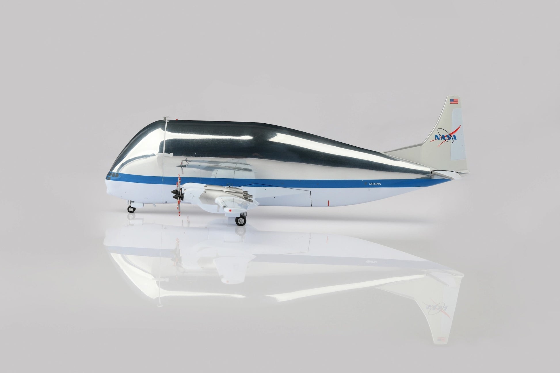 SQ Wings presents a highly detailed 1:200 scale diecast model of the NASA Boeing 377SGT “Super Guppy,” registration N941NA. This unique aircraft, instantly recognizable for its bulbous fuselage and oversized cargo capacity, has been one of NASA’s most iconic transporters for moving space hardware, oversized components, and critical aerospace equipment.
